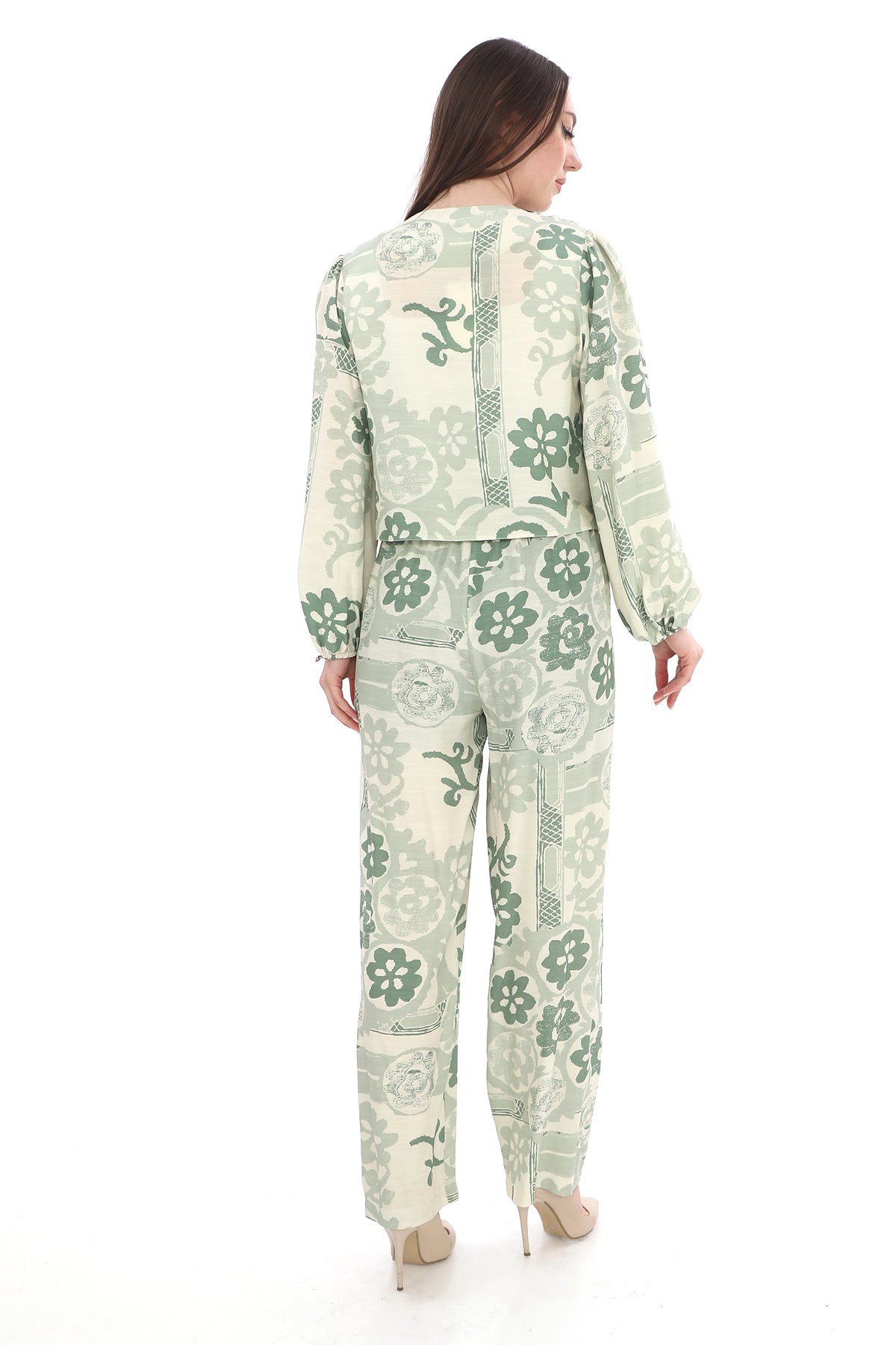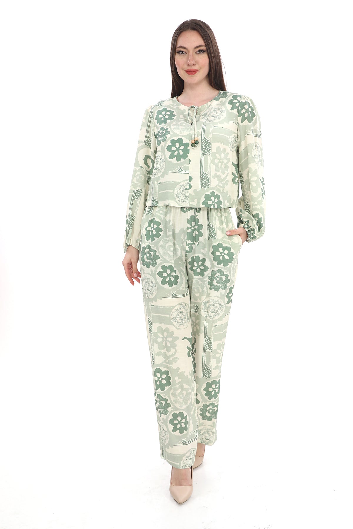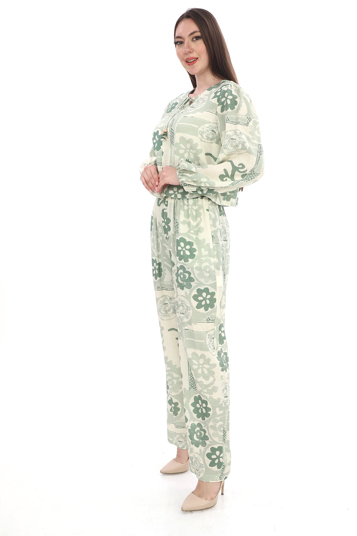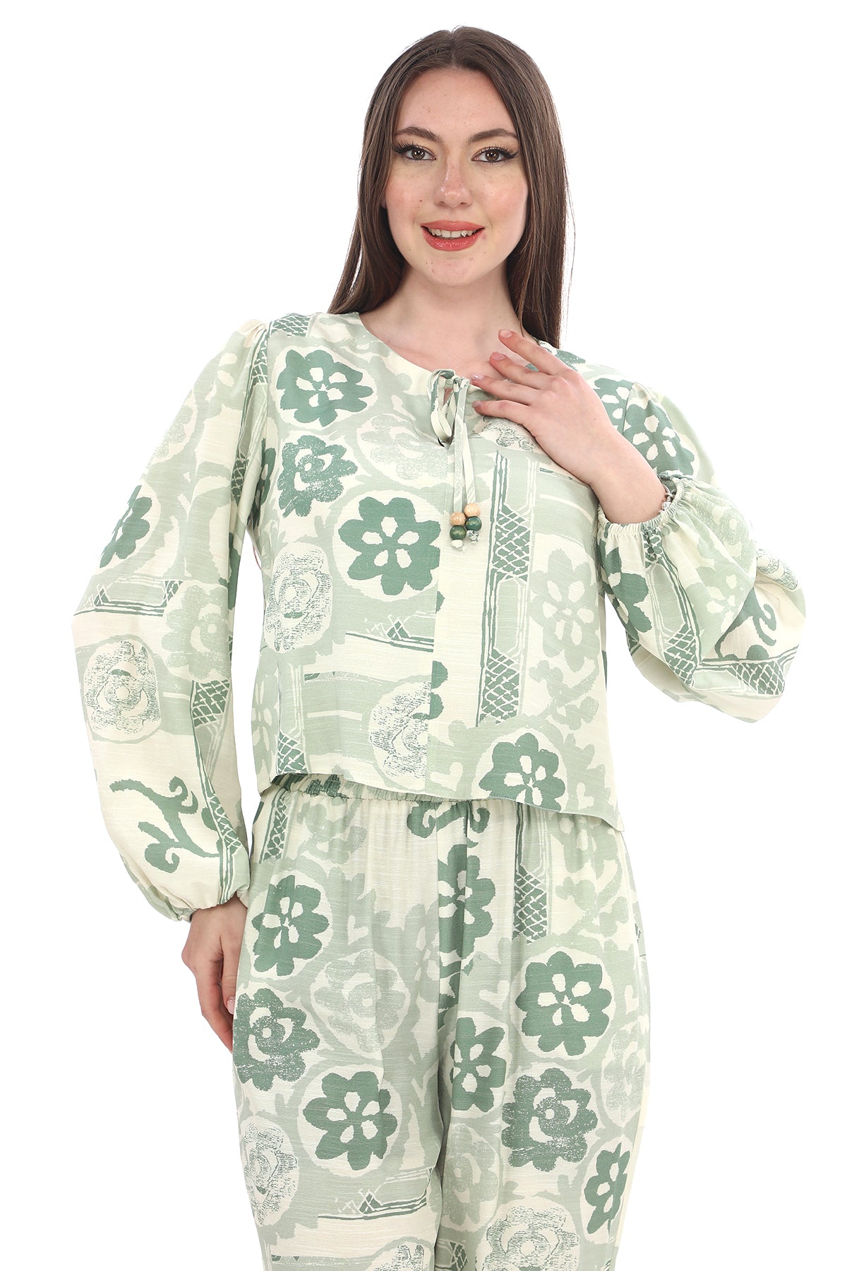 Keten Tensel Mint - Su Yeşili Çiçek Baskılı Bluz