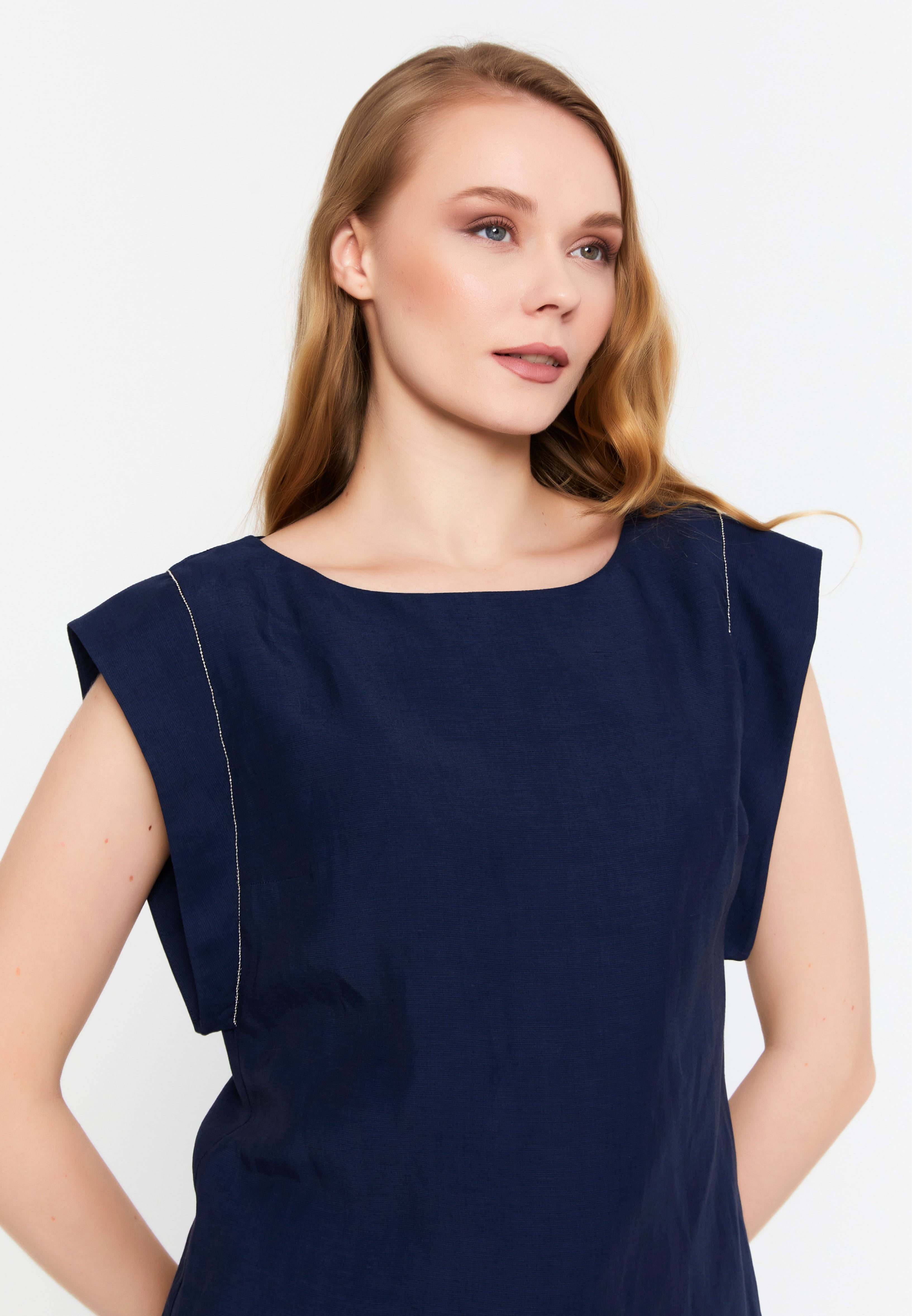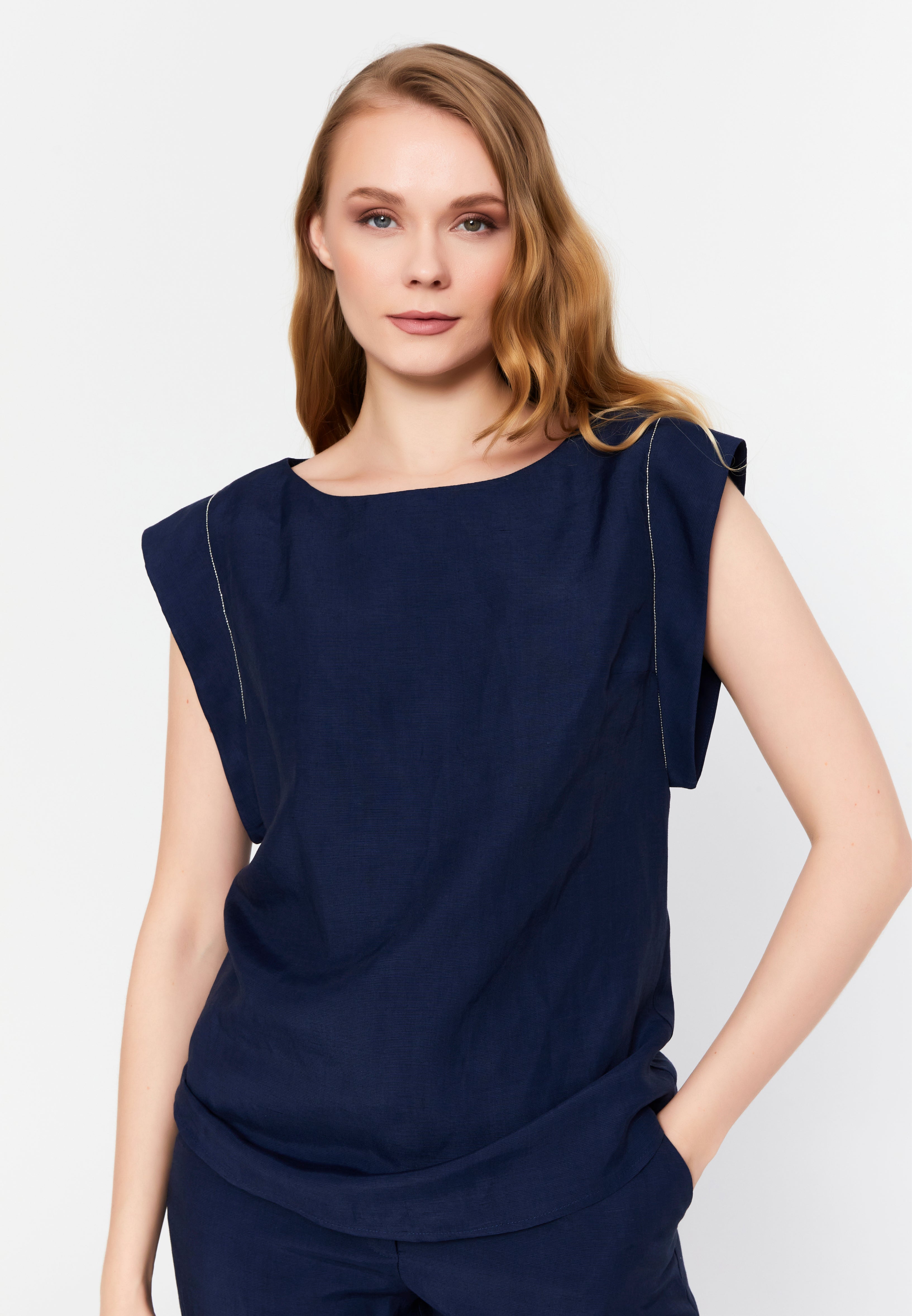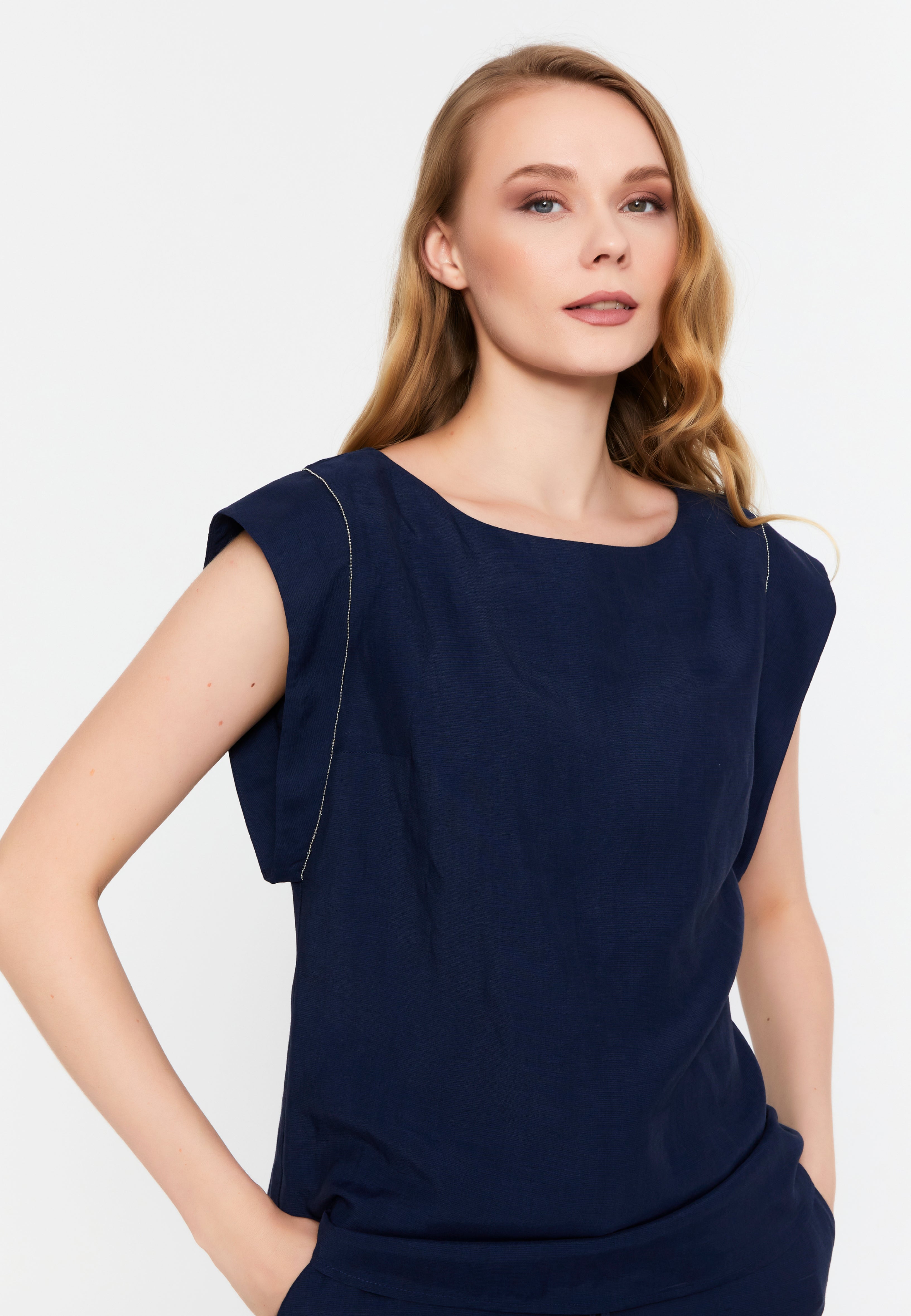 Viskon Keten Sıfır Kol Lacivert Bluz